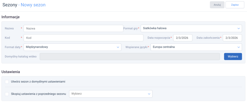 Wejdź w zakładkę Sezony, a potem kliknij przycisk „Nowy sezon” w prawym górnym rogu. Otworzy się okno, w którym musisz uzupełnić kilka podstawowych pól – bez nich sezon po prostu nie powstanie: