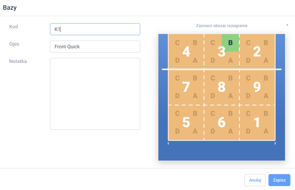 Użyj przycisku „Dodaj bazę”. Wybierz kod, którego będziesz używać podczas kodowania i wyszukiwania akcji. Pamiętaj, że podstawowy kod musi zaczynać się od litery K. Dodaj krótkie wyjaśnienie, do jakiego zagrania się odnosi. Po prawej stronie zobaczysz boisko – tam zaznacz strefę rozegrania przypisaną do danego kodu.