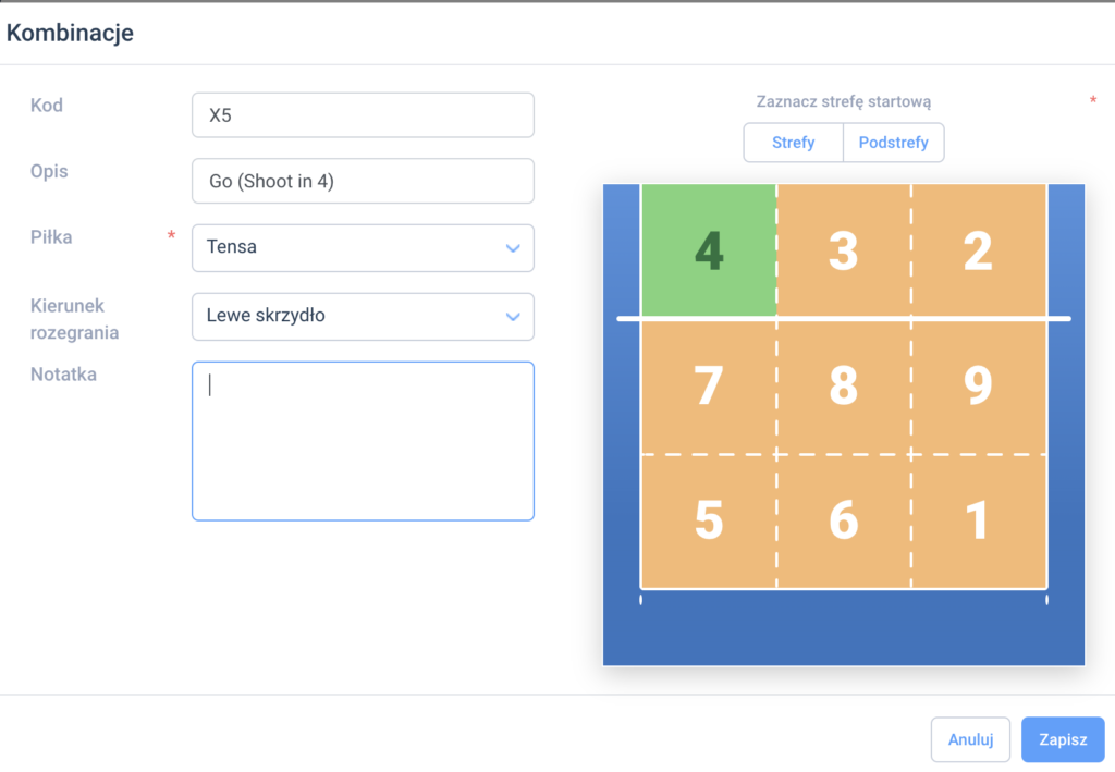 4. Określ kierunek wystawy – lewe skrzydło, środek, prawe skrzydło, pipe lub atak rozgrywającego.