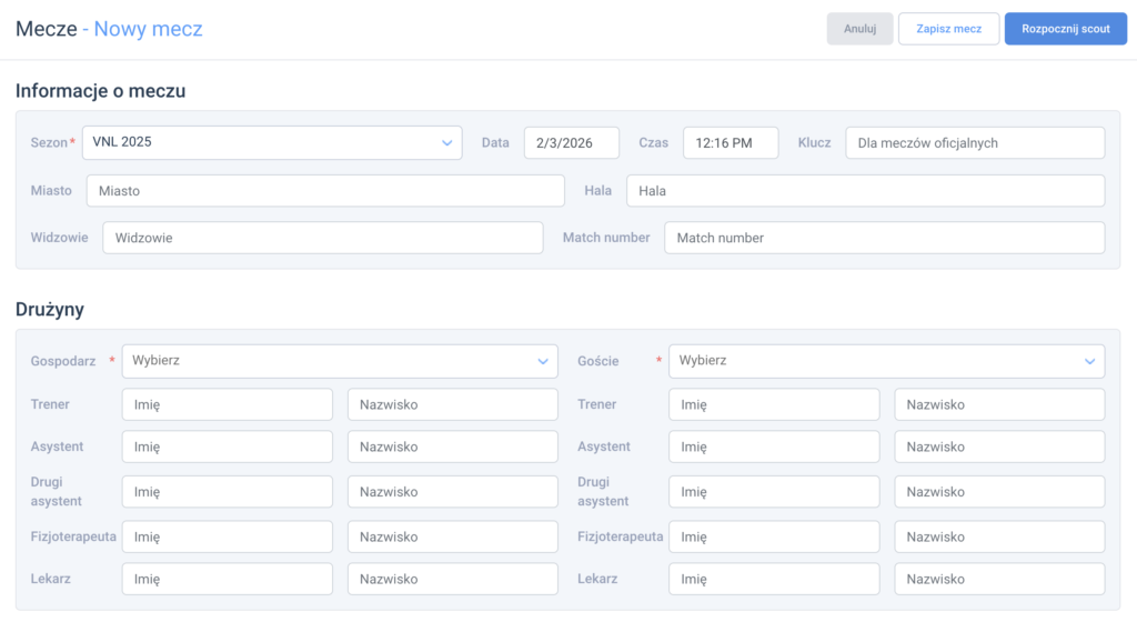 Aby stworzyć nowy mecz naciśnij niebieski przycisk w lewym górnym rogu – „Nowy mecz”. Następnie należy uzupełnić dane dotyczące danego meczu, czyli: