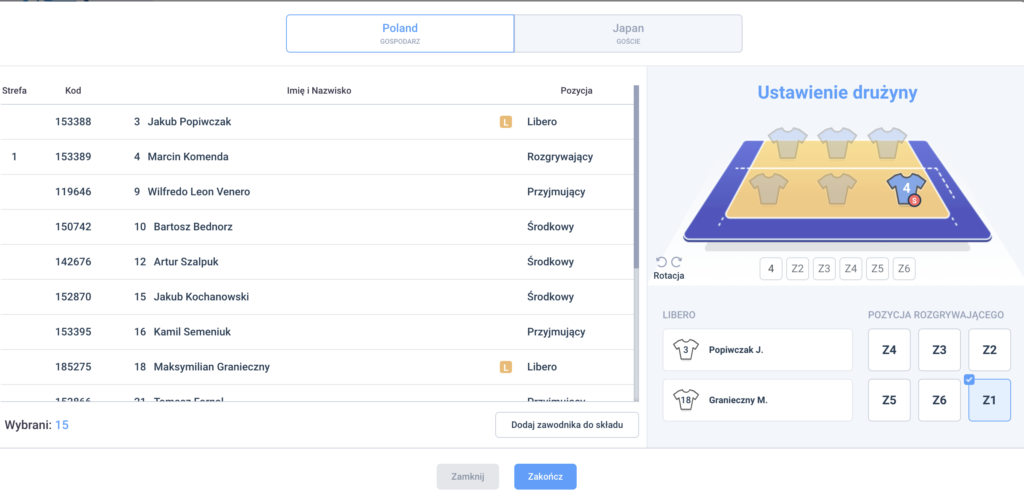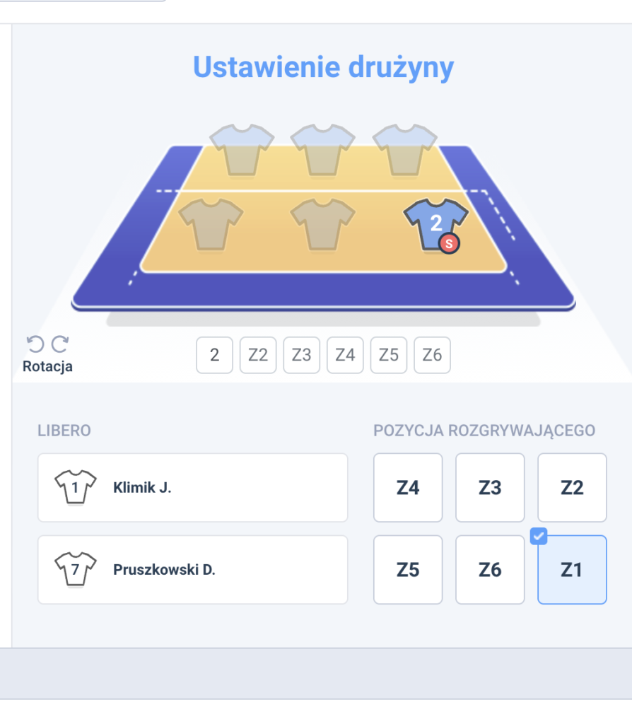 Następnie należy wybrać numery startowe szóstki zawodników aby rozpocząć spotkanie. Kliknij „Ustaw” i wpisz numery zawodników w odpowiednie strefy pod boiskiem. Jeżeli tworzysz mecz z wyprzedzeniem i nie znasz jeszcze składu wyjściowego zespołów możesz tu wybrać jedynie rozgrywającego i przypisać rotację każdemu z zespołów. Natomiast w dalszej fazie, już po stworzeniu meczu będzie można nanieść tu zmiany, uzupełnić szóstkę wyjściową i zmodyfikować ustawienie, jeżeli będzie taka potrzeba.
